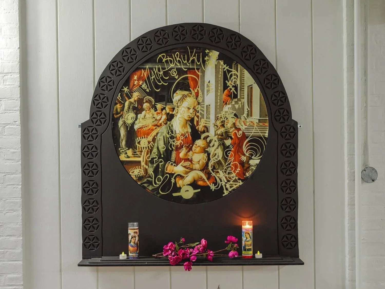 Altar to Nana Buruku, 2017. Installation and print. Fabricated altar, digital and silkscreen print. Candles to Saint Barbara and/or Saint Martin, silk and/or fresh flowers.
