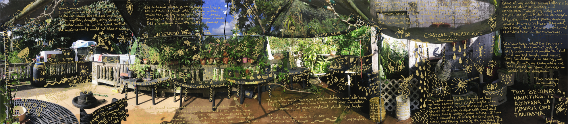 Mano de Obra. When I was a child, my parents and I lived in a wooden house in Borikén in the mountains. We resisted hurricane winds together, droughts, rainy seasons. The wooden house now gone, its foundation left bare. My parents for years have been using this foundation as a terrace to grow medicinal herbs. We have been rebuilding for such a long time. A recurring cycle of destruction and reconstruction. Cut and bruised hands and hearts. This foundation is so strong, we take it with us even when we are forced to leave Borikén and settle in the diaspora. This becomes a haunting.